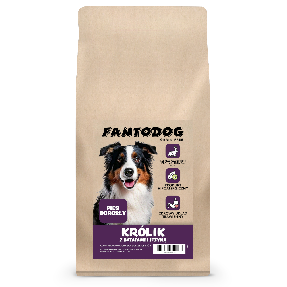 FantoDog Królik z Batatami i Jeżyną to wysokiej jakości karma hipoalergiczna, z dużą zawartością świeżego mięsa z królika, wzbogacona batatami i jeżynami polecana dla psów z wrażliwym układem pokarmowym.