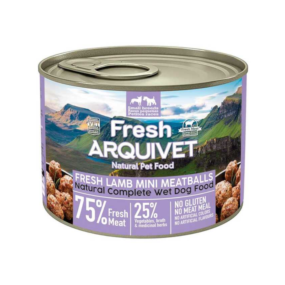 Arquivet Fresh Mini Klopsiki z Jagnięciny w Sosie to pełnoporcjowa karma dla psów dorosłych wszystkich ras, z wysoką zawartością świeżego mięsa, co czyni ją bardzo smakowitą, pyszną i łatwostrawną. Wyprodukowana z naturalnych i lokalnych składników, gotowanych na wolnym ogniu, aby zachować wartości odżywcze. Bez glutenu, bez mączek mięsnych, bez barwników i sztucznych aromatów.