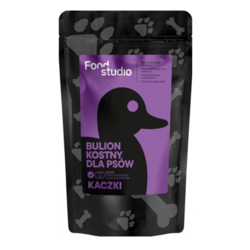 Bulion przygotowywany jest ręcznie z kości kaczki, w procesie gotowania trwającym co najmniej 12 godzin, aby uwolnić cenne składniki (w tym kolagen). Nie stosuje się sproszkowanych dodatków — to, co trafia do miski psa, to wynik naturalnego procesu. Bulion pozbawiony jest tłuszczu (usuwanego po ugotowaniu) i ma niską kaloryczność, co czyni go odpowiednim nawet przy redukcji wagi.